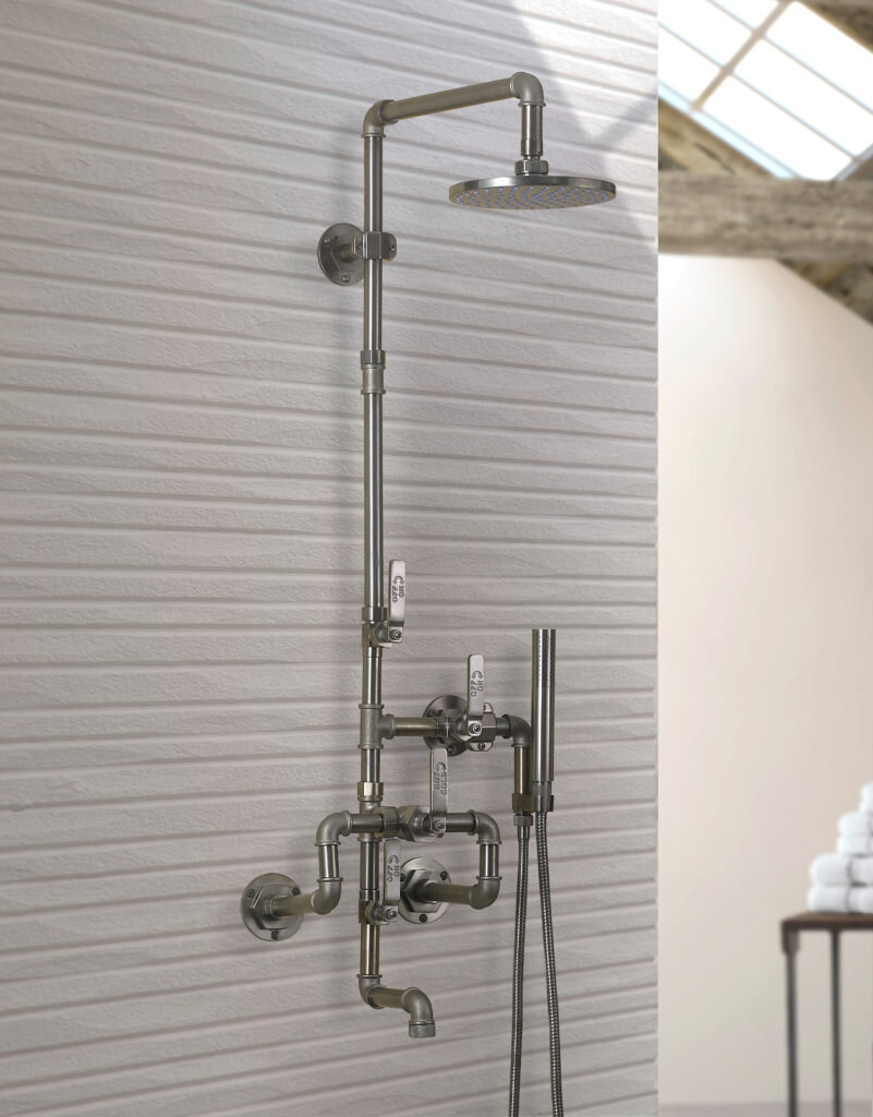 Style and substance come together beautifully in this shower system from Waterworks, with an overhead faucet joined by a bathtub spout and a wonderful shower “wand” that works like magic and cleans like a dream.