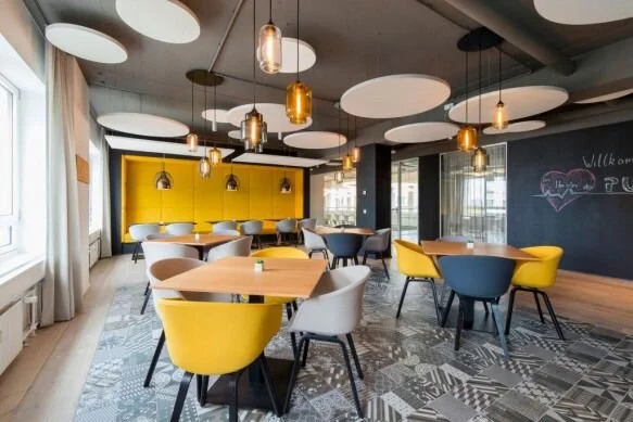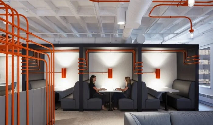 This appealing approach to adaptability is felt immediately in this new kind of office space. The company entrance opens into coffeeshop-style surroundings complete with cafe tables and busy baristas. No need to stop for a cup on your way to work, now you can grab your morning latte once you arrive at the office and hang around for a while for a friendly, unhurried start to the day.