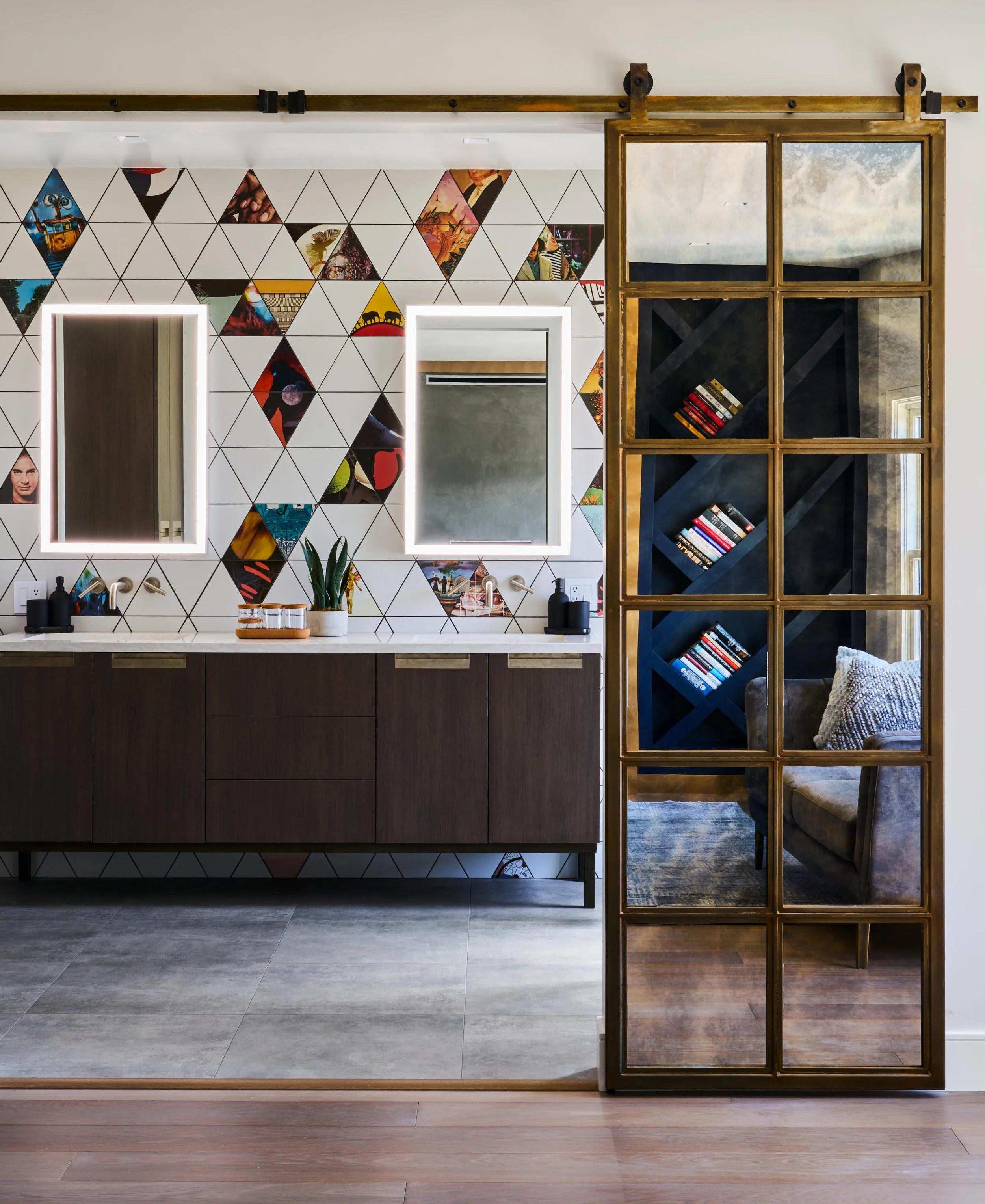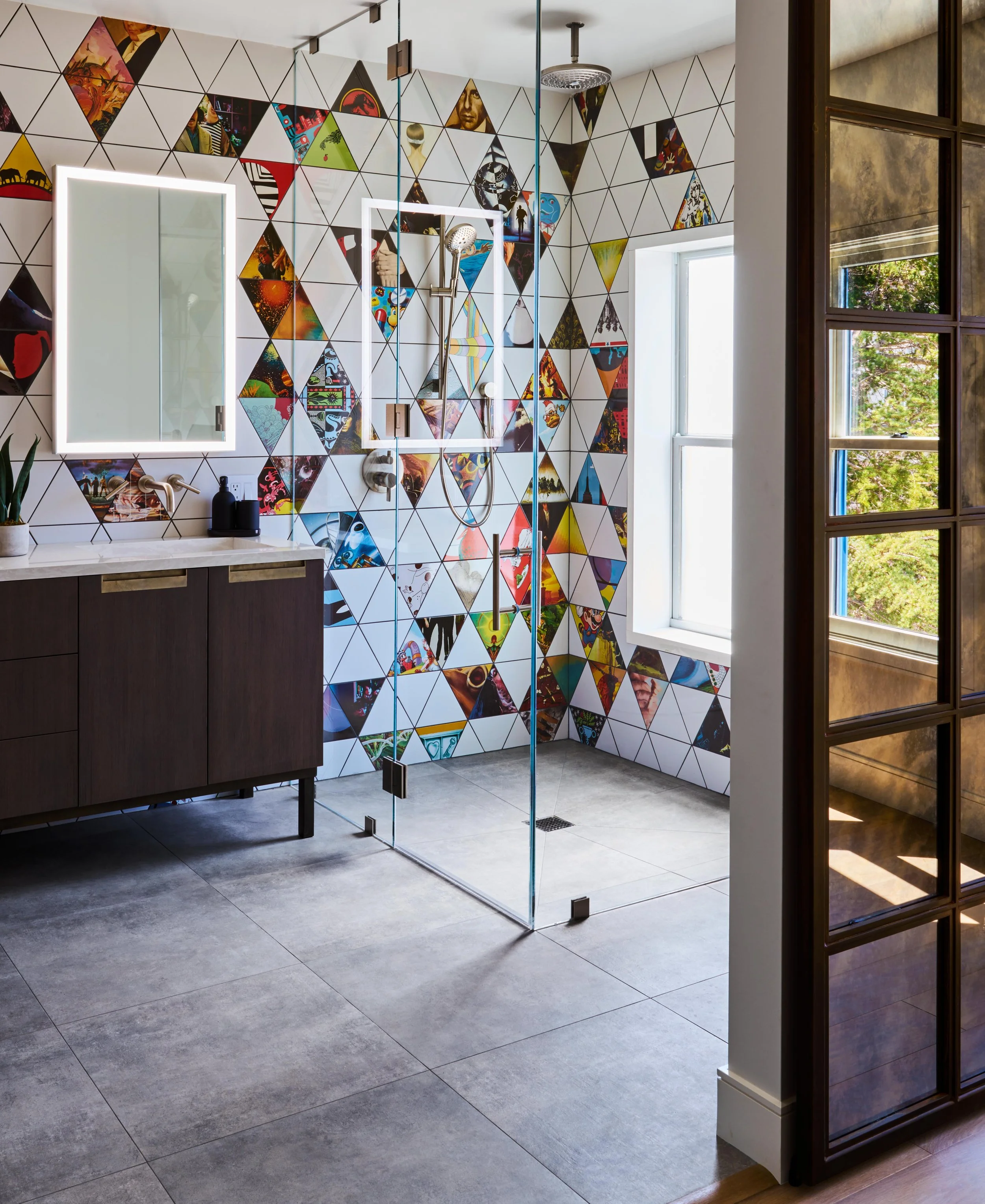 Custom printed images on triangular tiles featuring zoomed-in snapshots of the owner’s favorite books, albums, and other cultural milestones outline the master bathroom (a callback to the owner’s first residence), giving you something to consider while in the shower. Every guest and construction worker spent hours marveling at this unique feature!