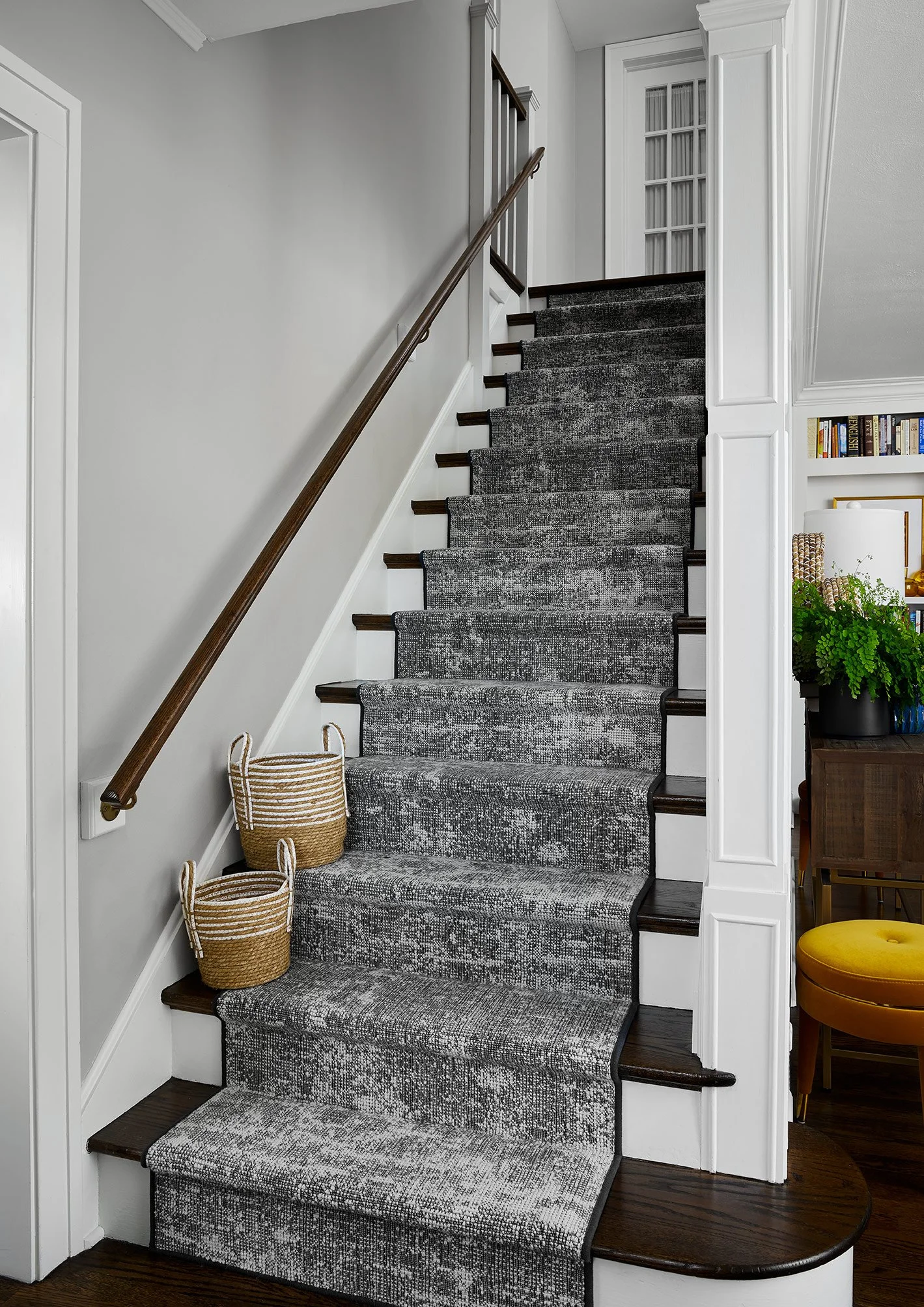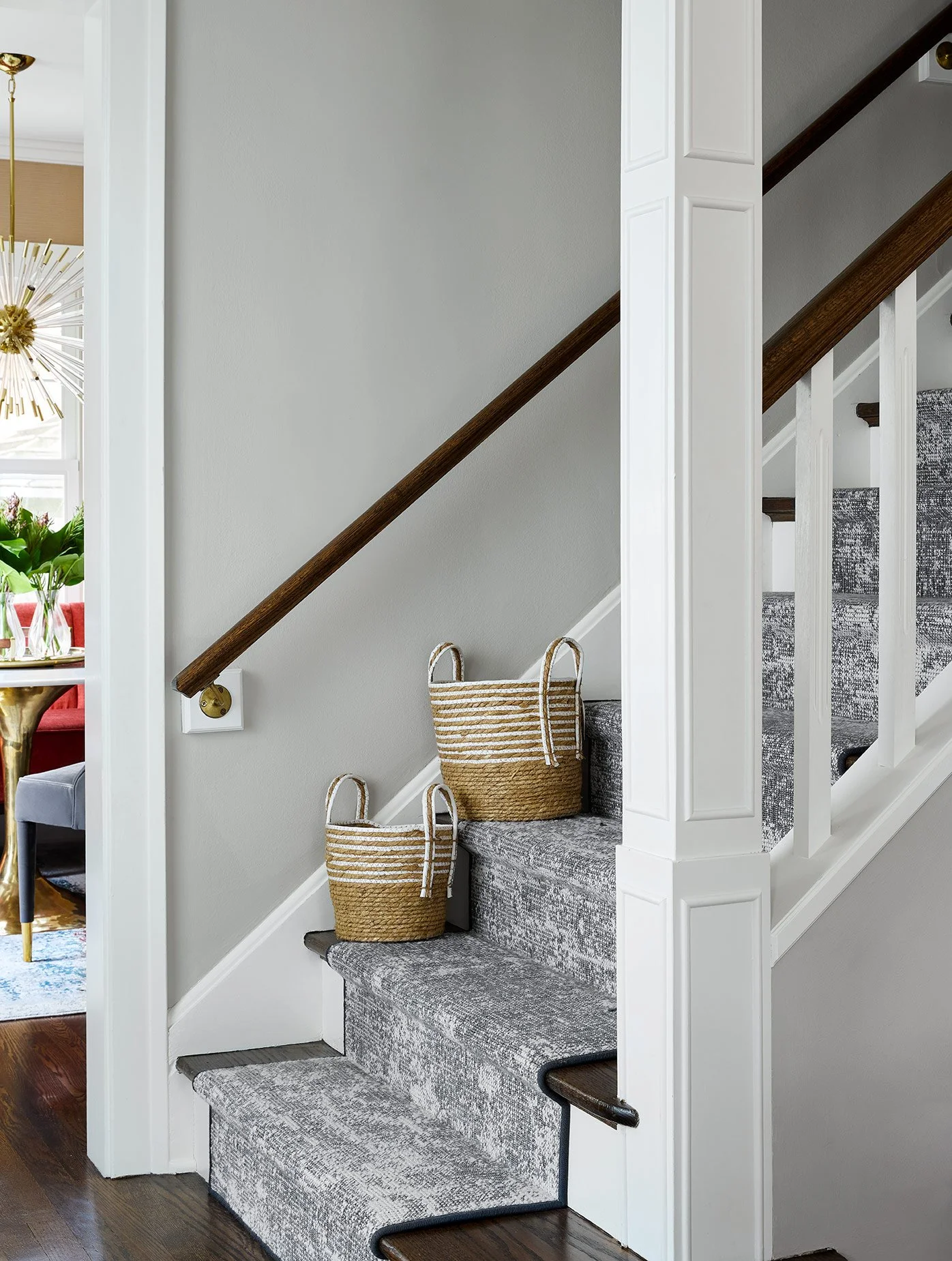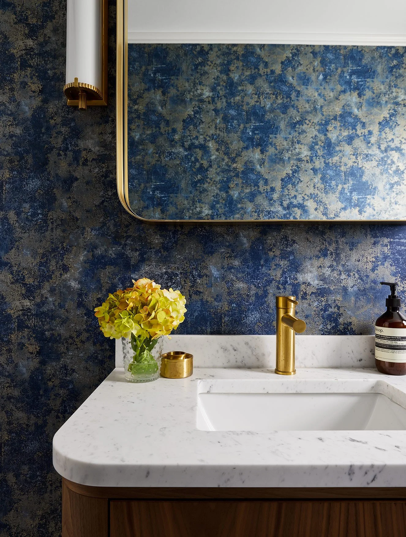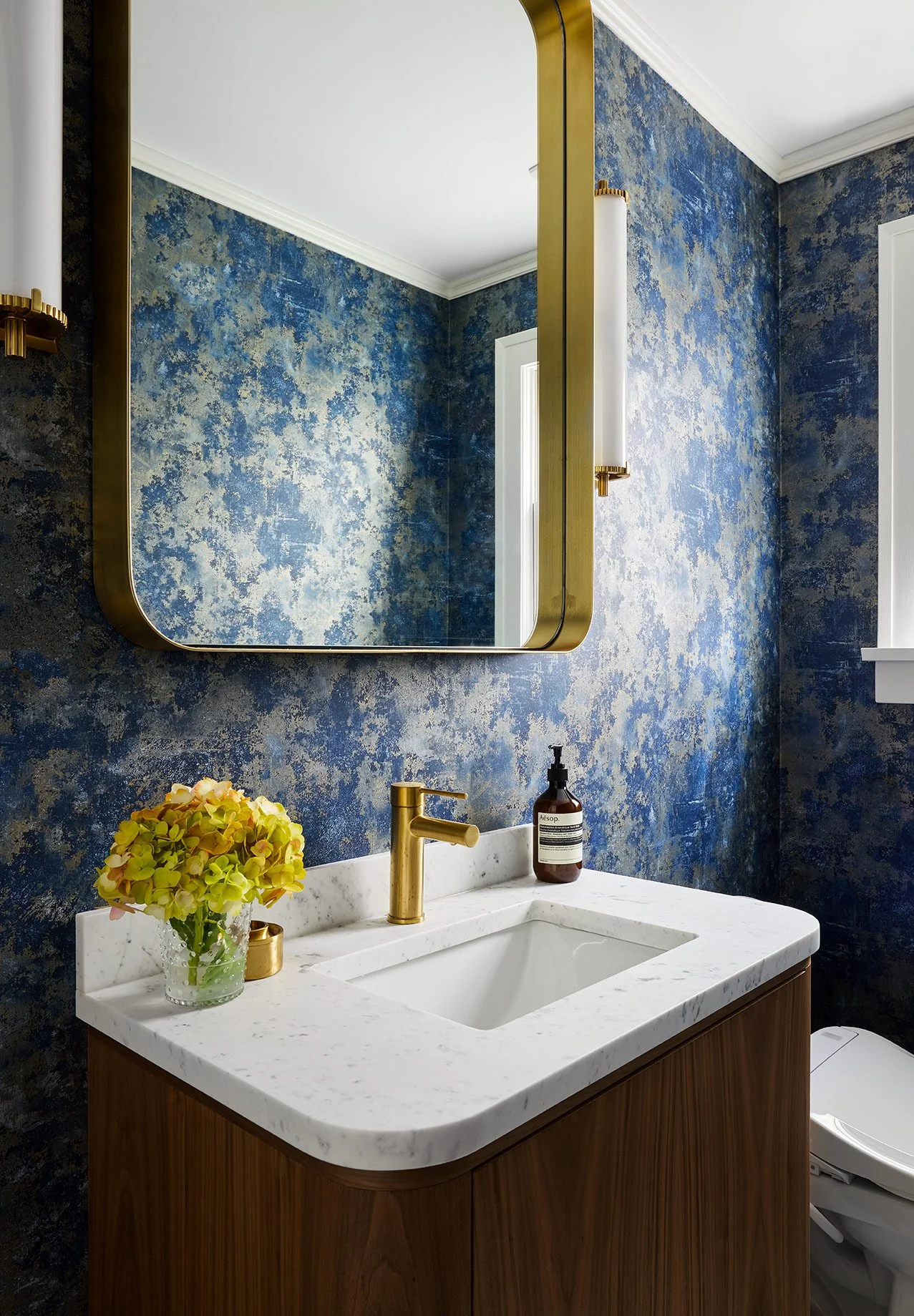 The powder room was overhauled to go from ‘meh’ to ‘wow’, proving that even a small space can be transformed by impactful design. The custom vanity, lively wallpaper, and elegant lighting now match the energy and style of the rest of the first floor