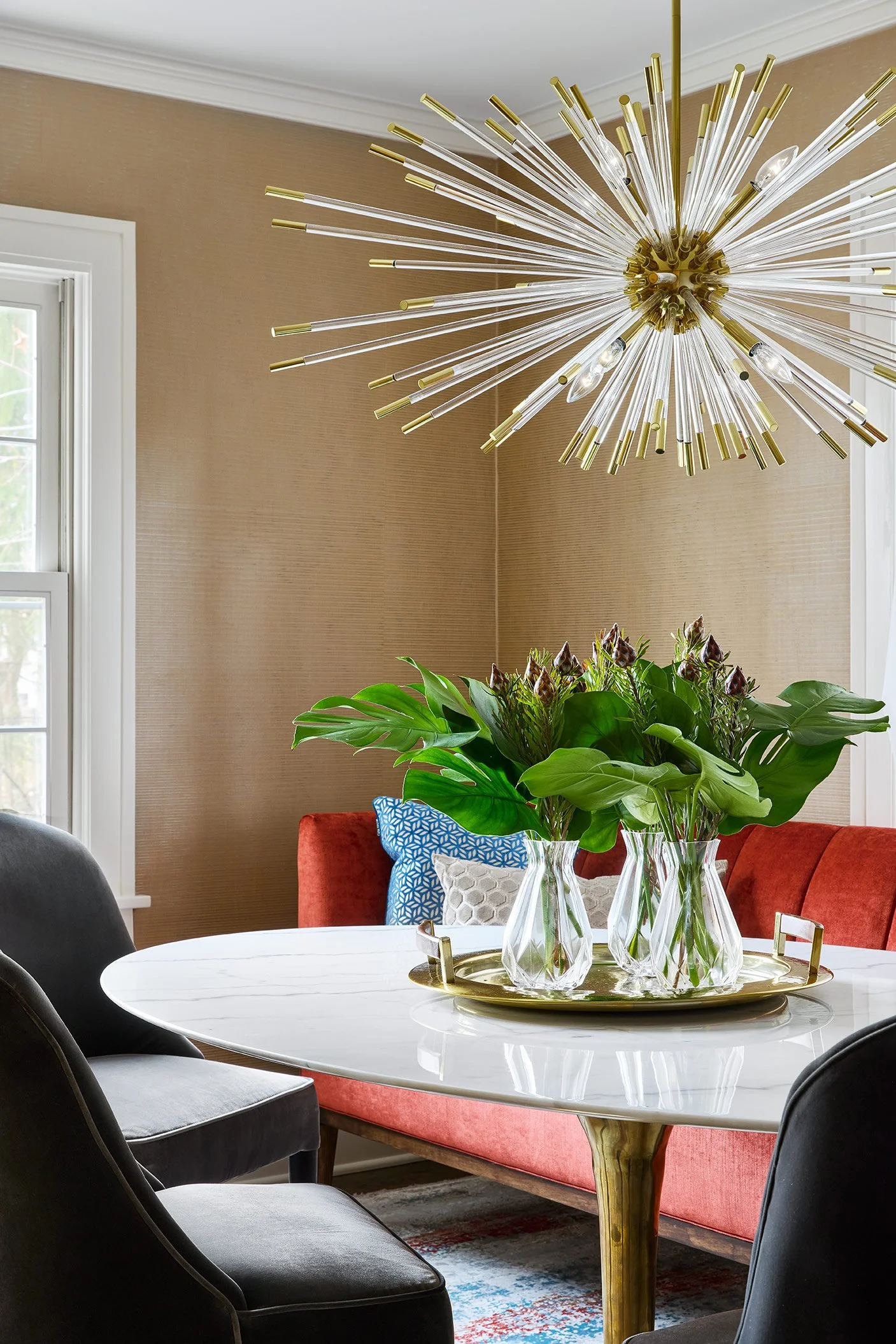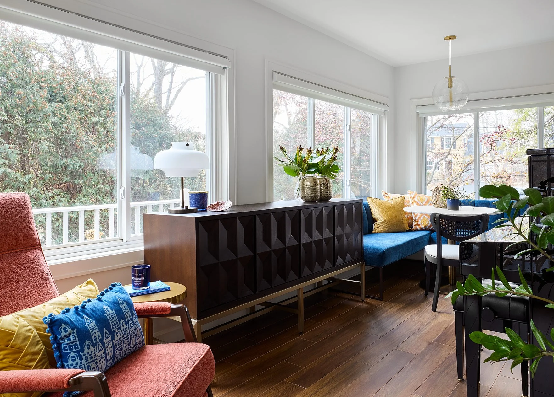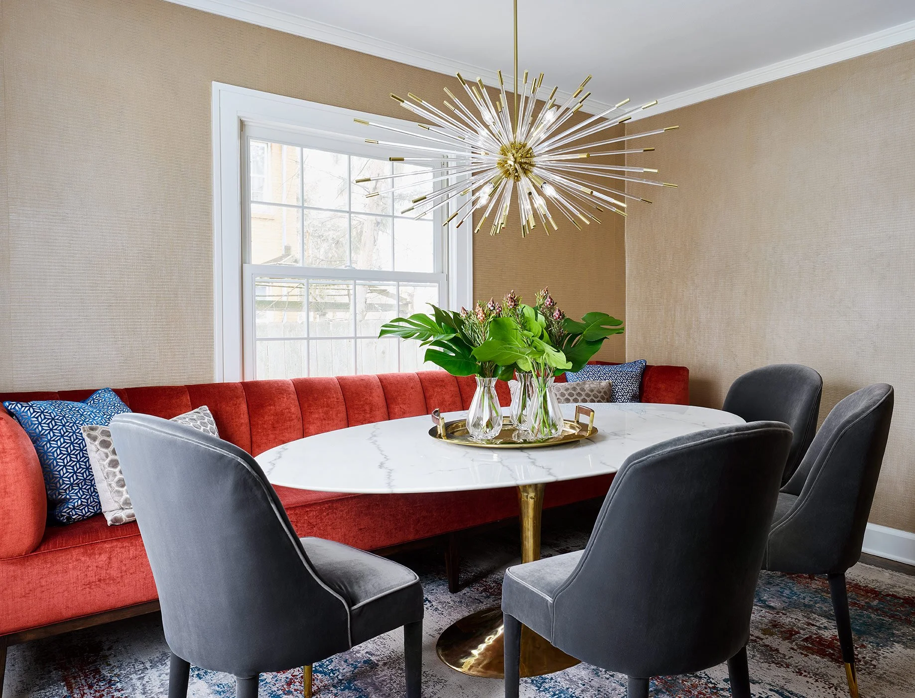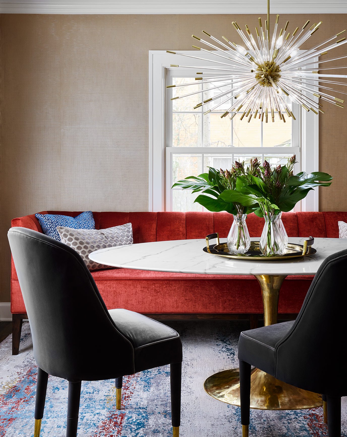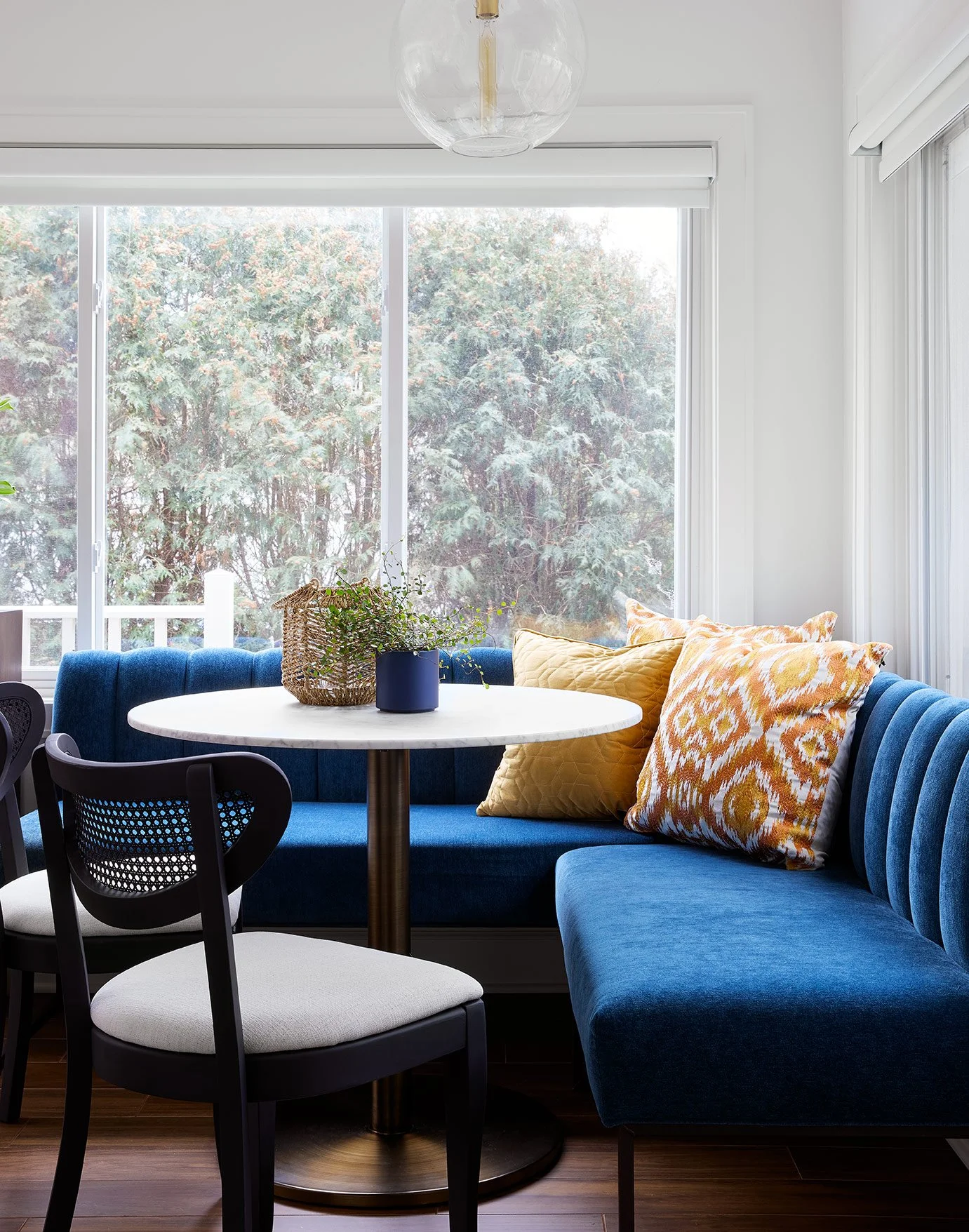 Keeping with the effervescent aesthetic while maintaining a focus on maximizing the space, the dining room evolves from cramped and clunky to fabulously functional by incorporating a luxurious banquet and table set along the wall to open up circulation throughout the home and making the room feel spacious.