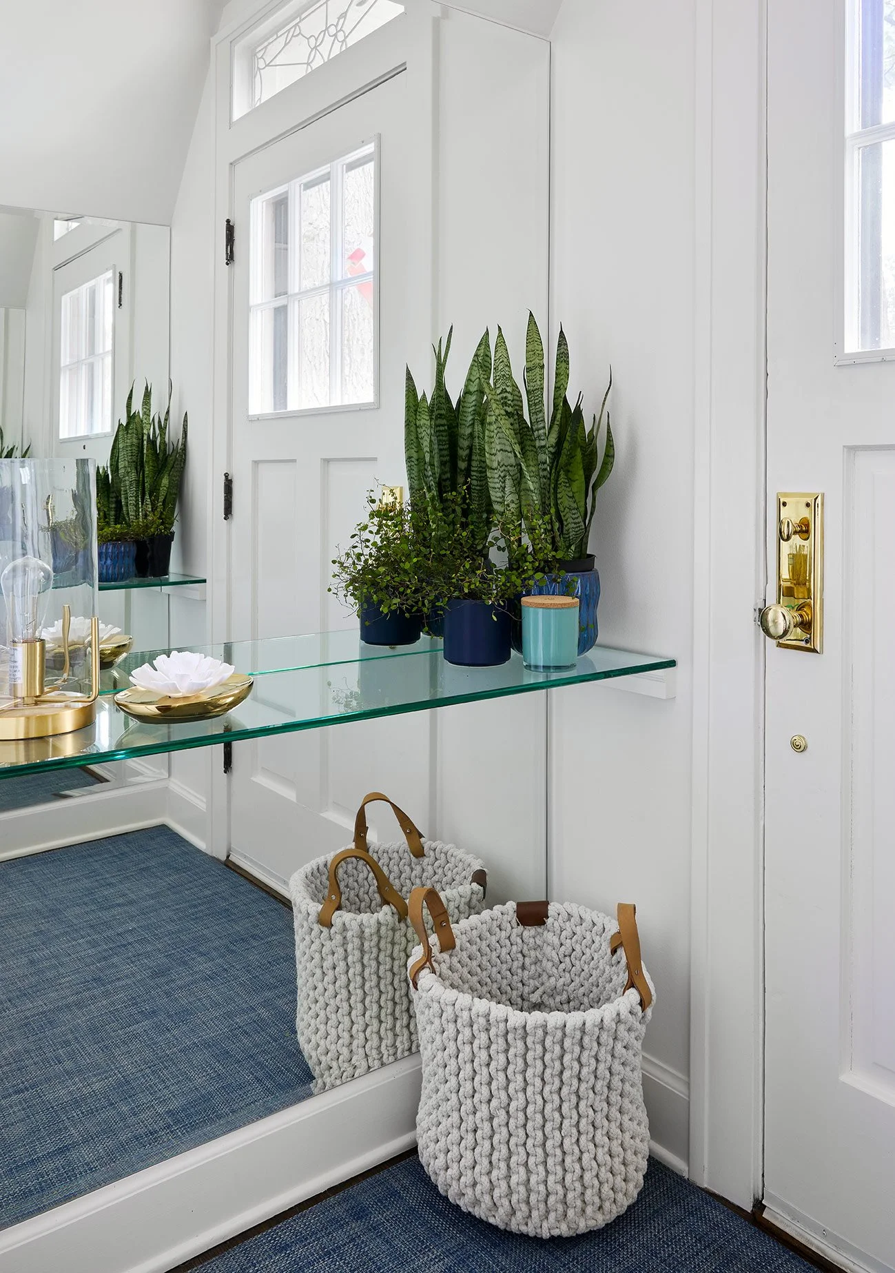Starting from the front door, we overhauled the foyer to make a statement the moment you walk in. Once you step inside you’re greeted by twin, full-length mirrors flanking you on either side with tempered glass shelves. This allows the light from this old home to filter better through the entryway.