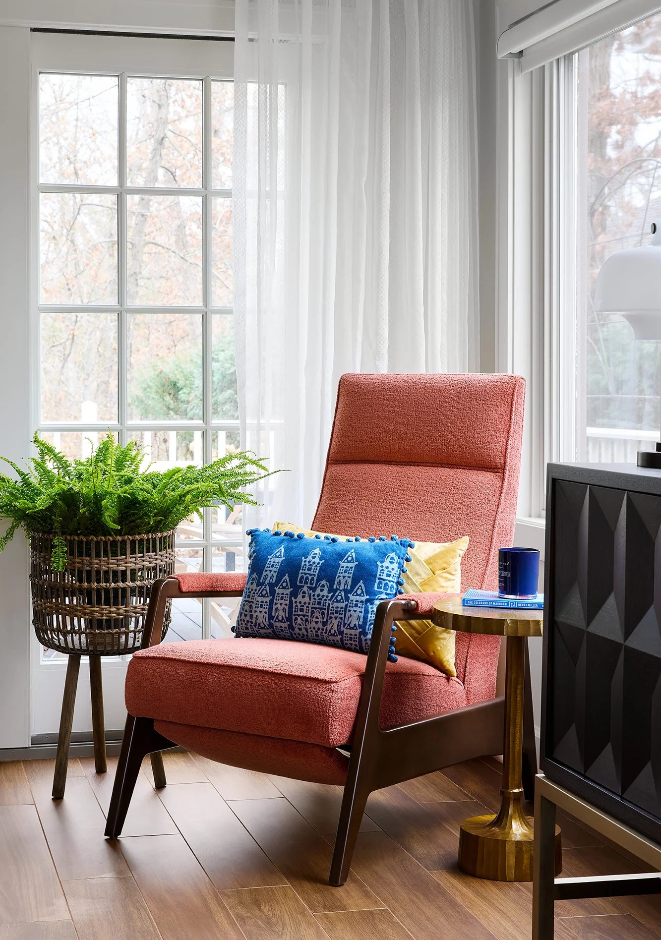 The sunroom was perhaps the most underutilized space in the home and had been overtaken by mismatched furniture and children’s toys. With light pouring in from an abundance of windows and a view overlooking the backyard, we seized the opportunity to reclaim the room with a chic l-shaped banquette and table, a cozy reading nook, and space for the piano. The room comes to life with vibrant artwork, colors, and patterns that harken back to her Indian heritage.
