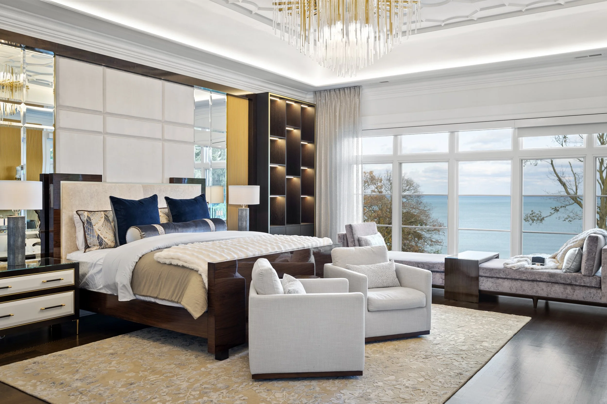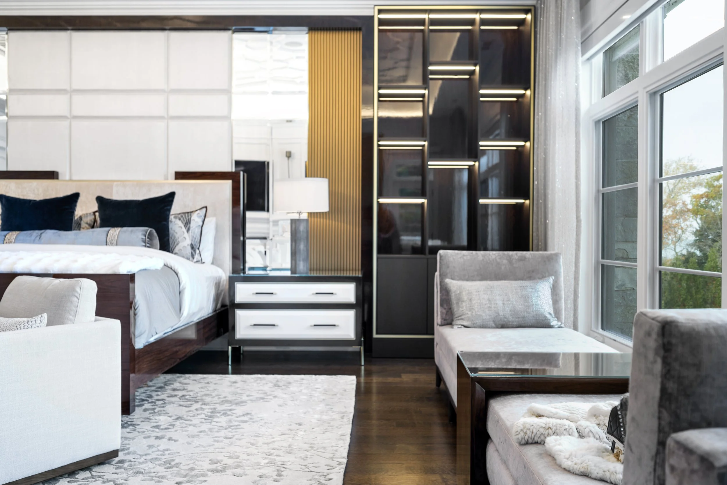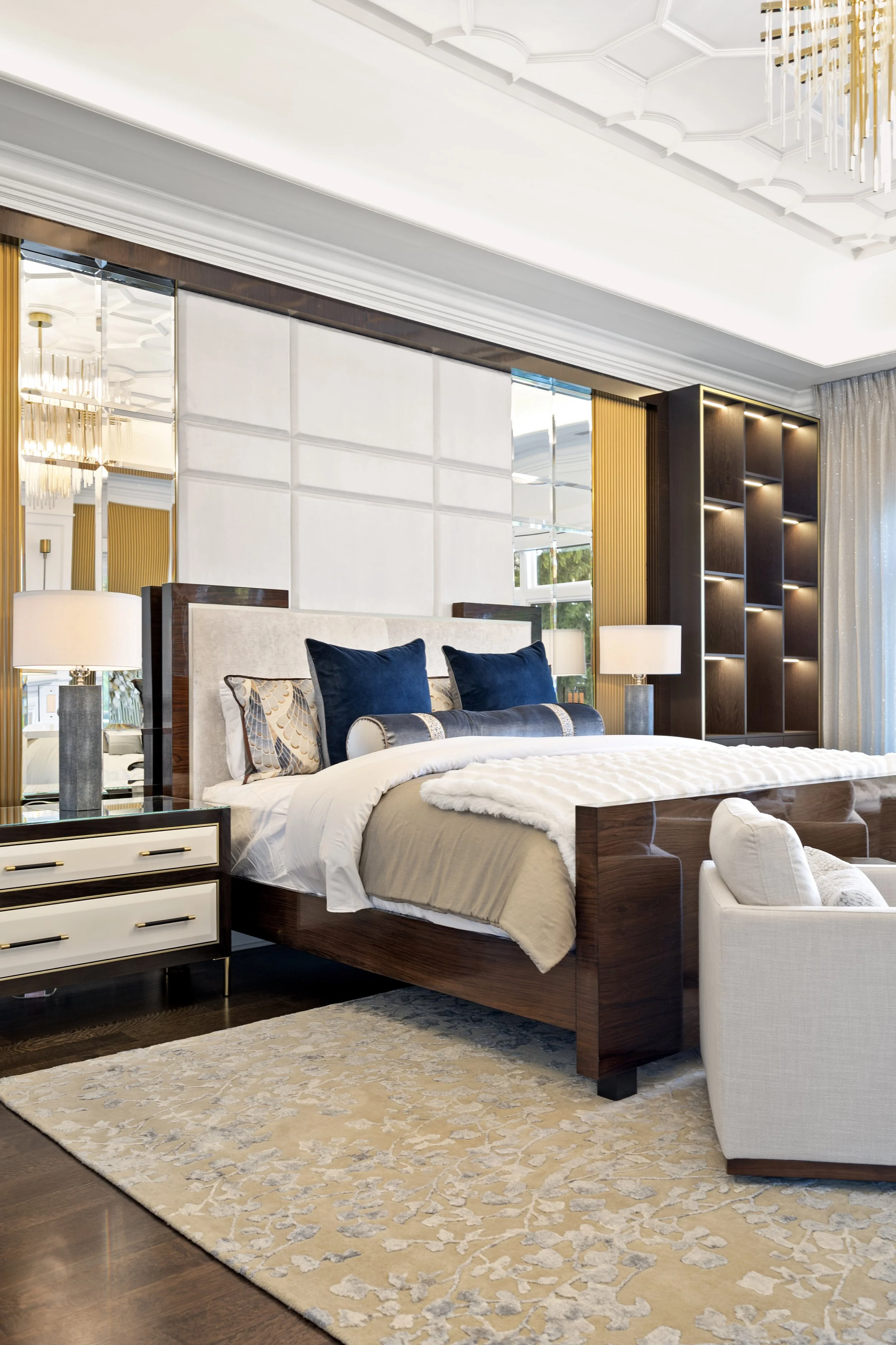 Indulge in the opulence of the master bedroom, where a captivating mix of mirrors, reeded panels, and luxurious upholstery adorn the walls. A custom bench with an integrated sofa table adds a personalized touch, complementing the new rosewood-framed bed dressed in exquisite bedding. Adorn the space with carefully chosen accessories like sculptures and mirrors, elevating the ambiance to sheer elegance.