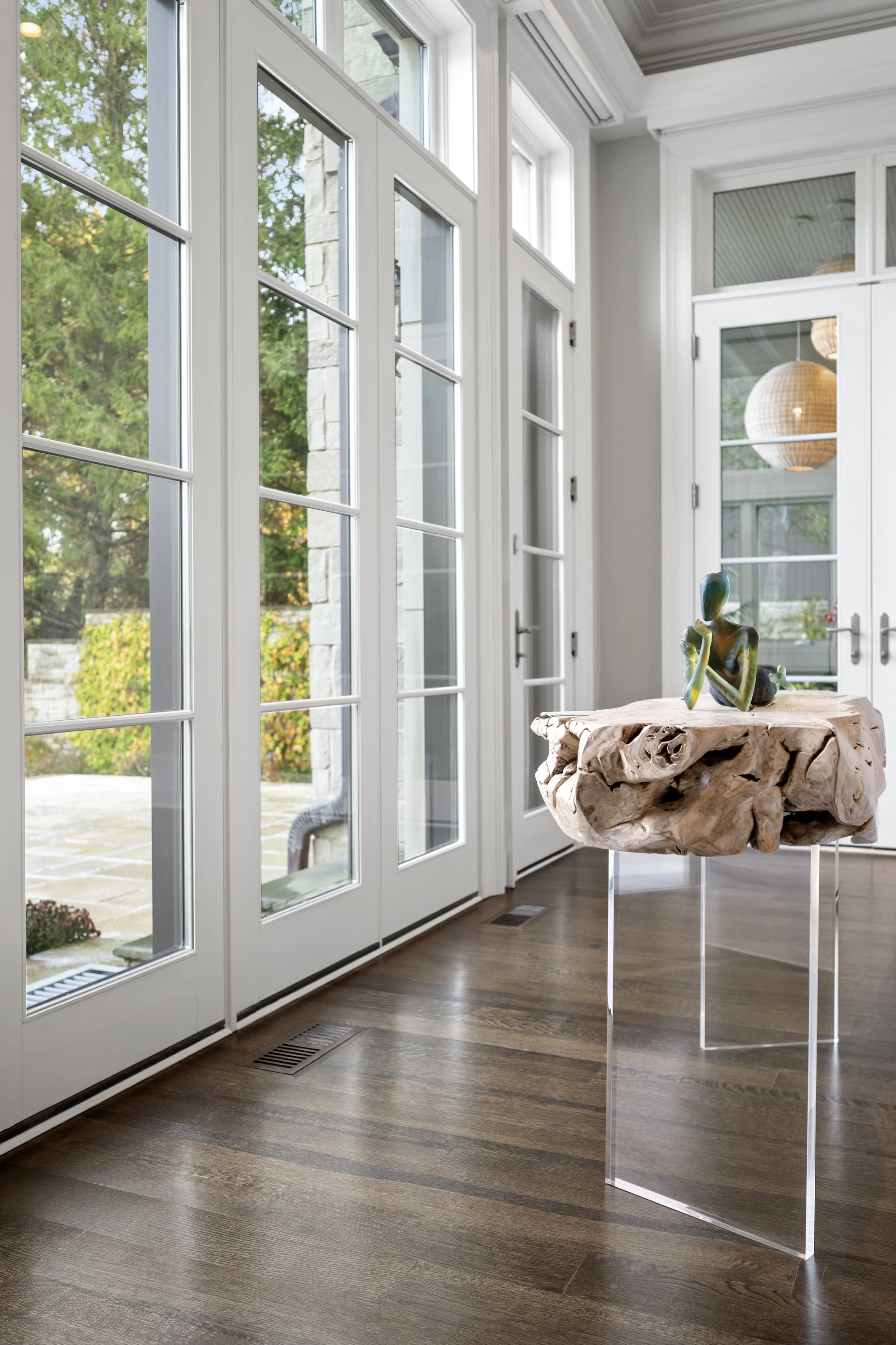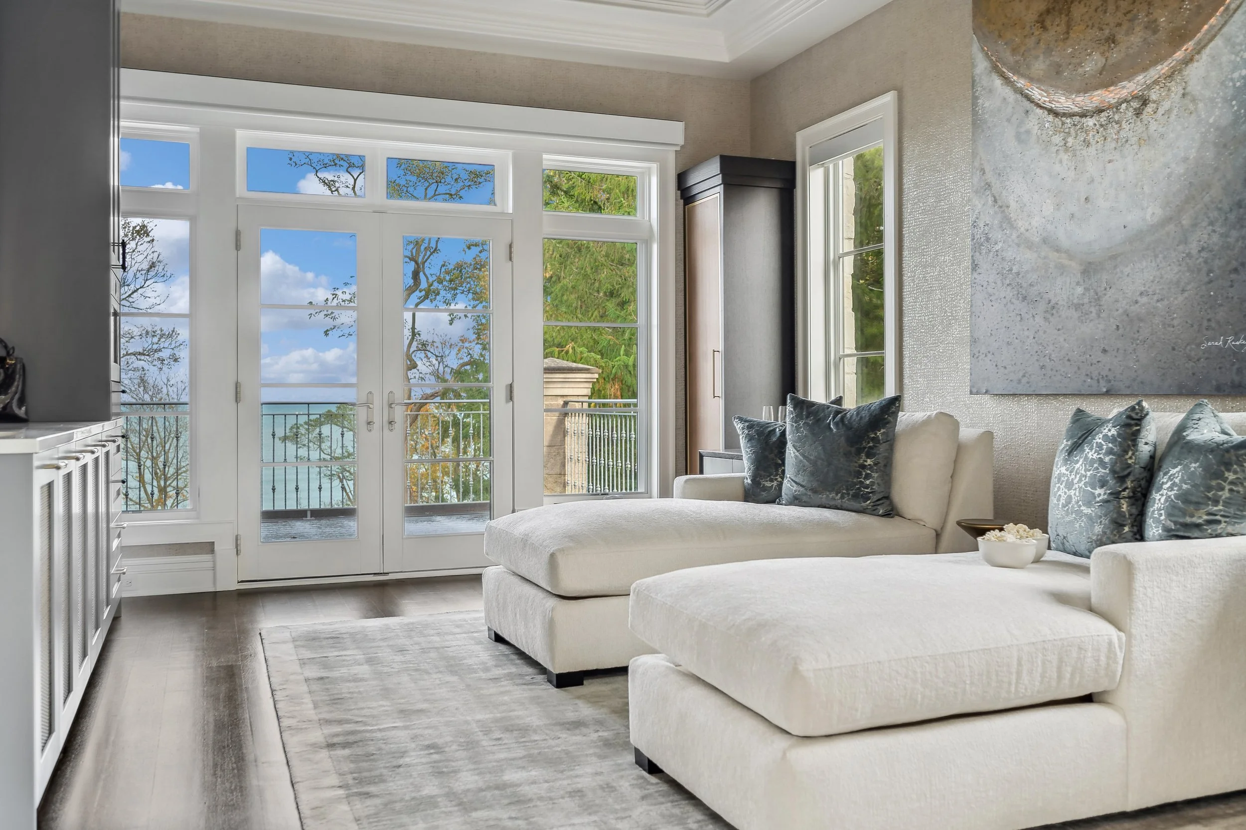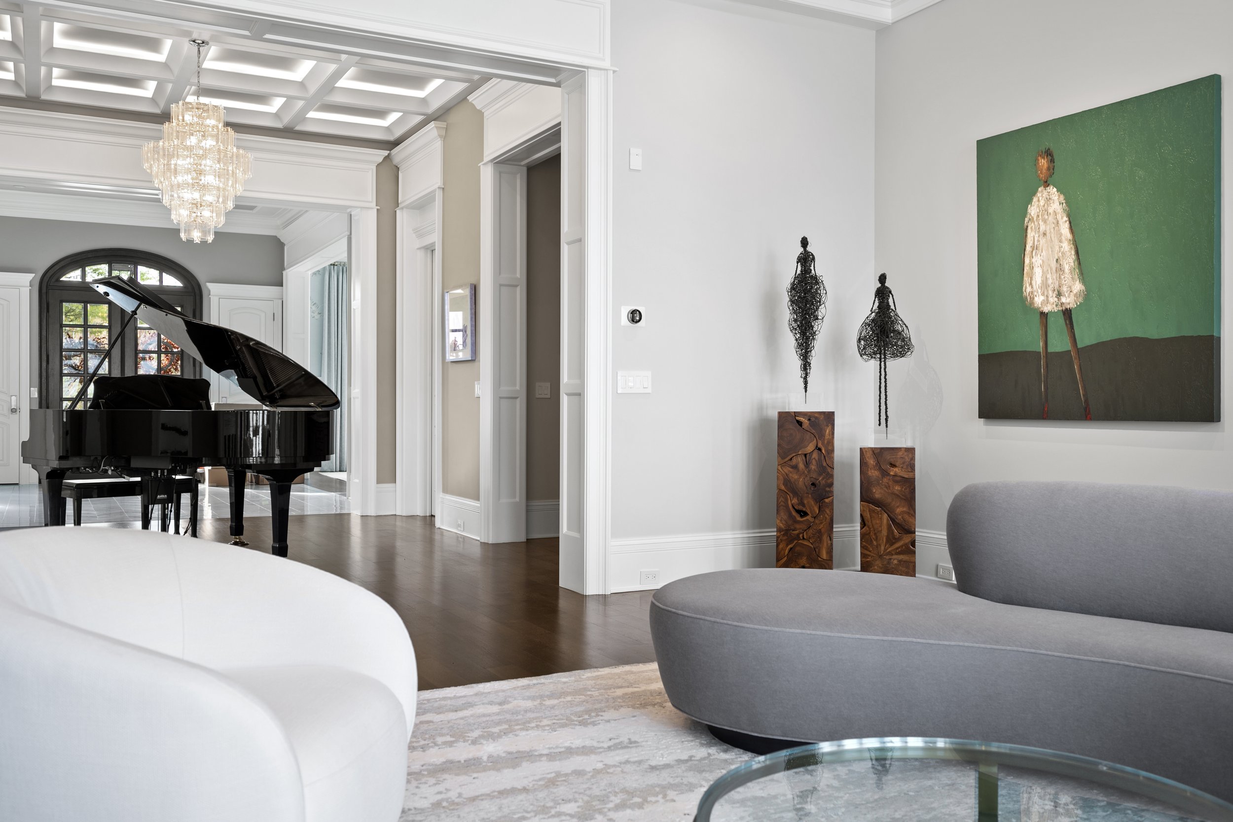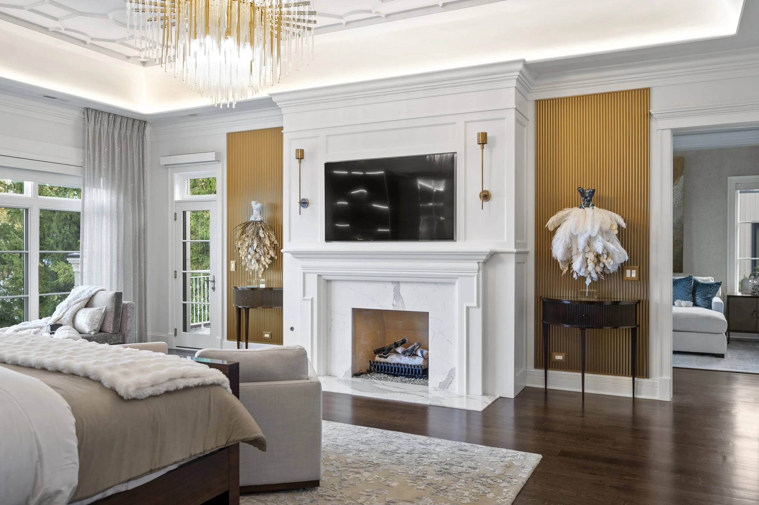 Indulge in the opulence of the master bedroom, where a captivating mix of mirrors, reeded panels, and luxurious upholstery adorn the walls. A custom bench with an integrated sofa table adds a personalized touch, complementing the new rosewood-framed bed dressed in exquisite bedding. Adorn the space with carefully chosen accessories like sculptures and mirrors, elevating the ambiance to sheer elegance.